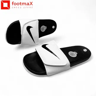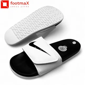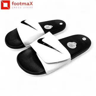 These popular slip-on slides feature a comfortable, black textured footbed designed for soft cushioning. The broad, adjustable single strap in crisp white proudly displays the bold black Nike Swoosh, providing that instantly recognizable athletic aesthetic. The strap also appears to have a textured or ribbed inner lining for added comfort and grip. The lightweight and durable construction ensures comfortable support and easy wear, making them a versatile choice for your daily routine in Dhaka.