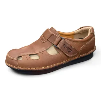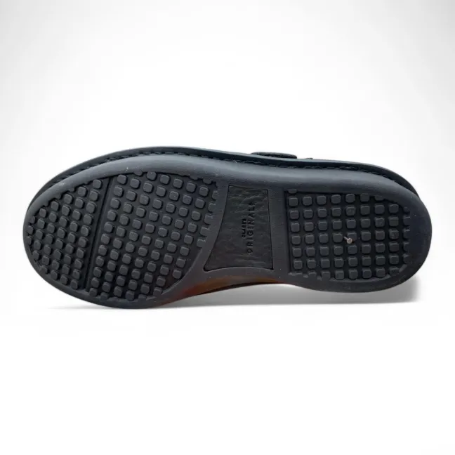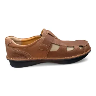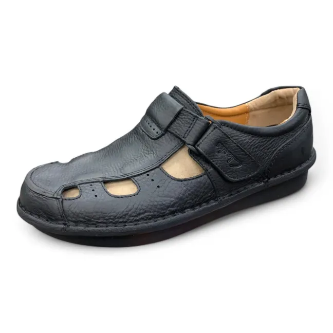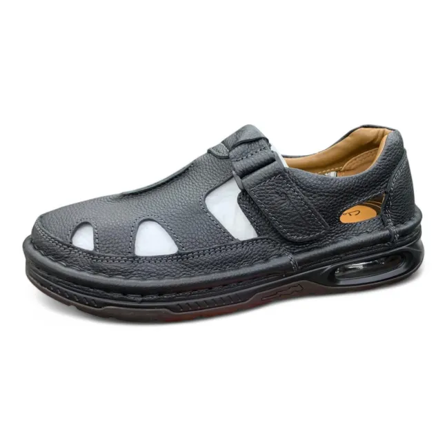 Experience the perfect blend of comfort and distinctive style with these men’s black leather fisherman sandals. Crafted from supple black leather, these sandals feature a classic fisherman design with unique cut-out details for enhanced breathability. The hook-and-loop adjustable strap ensures a secure and customized fit, while the cushioned footbed provides all-day comfort. The chunky sole with visible air cushioning adds a modern touch and provides exceptional shock absorption. Ideal for casual outings, warm weather adventures, or adding a touch of unique style to your look.