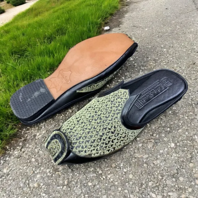 - Variant 1 (Black/Dark with Green Pattern): Showcases a dark base with an intricate, possibly geometric or woven, green pattern across the upper, framed by sleek leather accents and a classic Peshawari-inspired toe buckle.