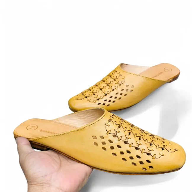 Men’s Yellow Leather Cut-Out Mules – Breathable Comfort & Unique Style