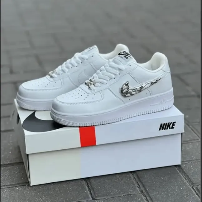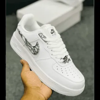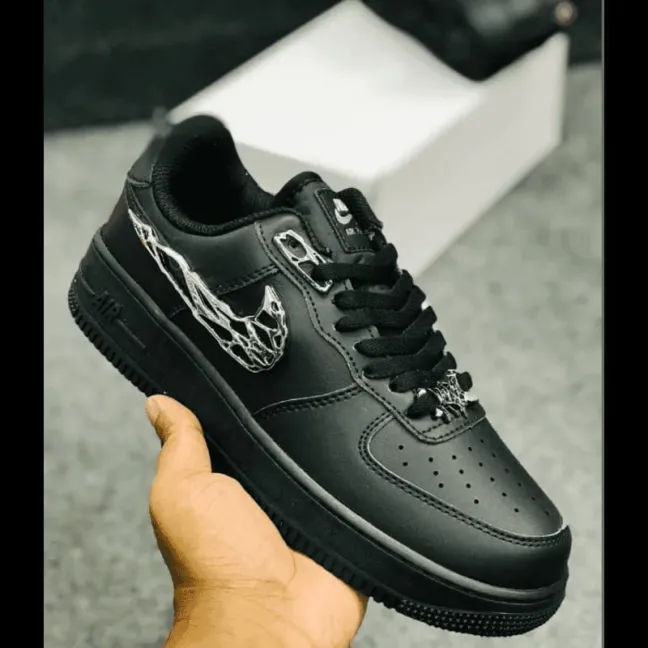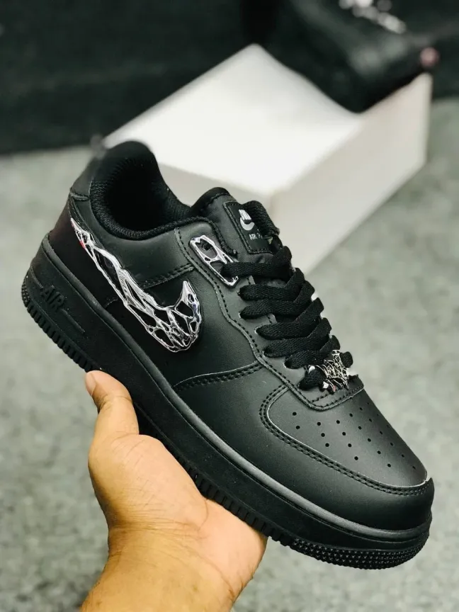 These Nike Air Force 1 “Cracked Leather” sneakers are a unique and stylish take on a classic silhouette. The black leather upper features a cracked leather design on the swoosh and heel tab, adding a touch of edgy flair. The comfortable cushioning and durable construction make these sneakers perfect for everyday wear.
