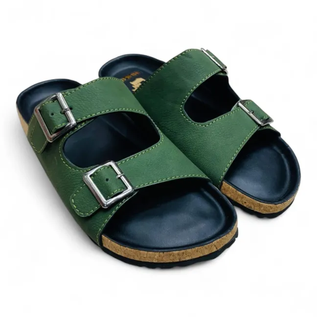 These sandals feature two adjustable wide straps in a rich forest green hue, crafted from a durable and comfortable material (likely synthetic leather or PU) with contrasting stitching. Each strap is fitted with a sleek black or silver-toned buckle, allowing for a customizable and secure fit. The prominent cork-inspired midsole not only adds a touch of natural aesthetic but also contributes to cushioned comfort. A sturdy black outsole provides reliable traction, making these sandals perfect for navigating the city streets or enjoying a relaxed day out in Dhaka.